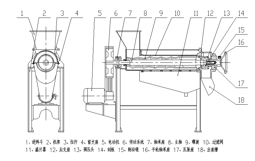 ★ 由前支座、進料斗、螺旋、過濾網(wǎng)、盛汁器、后支座、出渣槽等組成,螺旋主軸左端支撐于滾動軸承座內(nèi),右端支撐于手輪軸承座內(nèi),電機通過一對三角皮帶驅(qū)動螺旋進行工作。